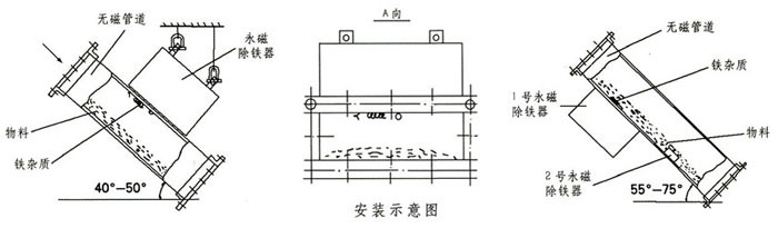 RCYA管道永磁除鐵器包括無磁管道和永磁鐵兩部分,專用于對封閉管道內(nèi)非磁性物料的除鐵,永磁除鐵器內(nèi)部采用高性能稀土強磁材料組成復(fù)合磁系。具有體積小、磁力大、重量輕、除鐵干凈、方便、無能耗、使用壽命長等特點。適合沒有輸送皮帶,只能提供下料溜槽的場合。當(dāng)散狀物料經(jīng)過管道式永磁除鐵器時,鐵雜物被高場強的永磁鐵所吸附,清除鐵雜質(zhì)時,打開管道專用門將雜質(zhì)取除。該設(shè)備適用于含鐵量較少的場合,含鐵較多的場合應(yīng)選用自卸式除鐵器。主要應(yīng)用于水泥、化工、煤炭、塑料、耐火材料、建材、造紙等行業(yè)的下料管道中清除鐵雜物。