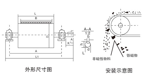型號 | 筒表磁場強度Gs | 皮帶速度≤m/s | 物料厚度≤mm | 重量kg | 外形尺寸mm | ||||||||